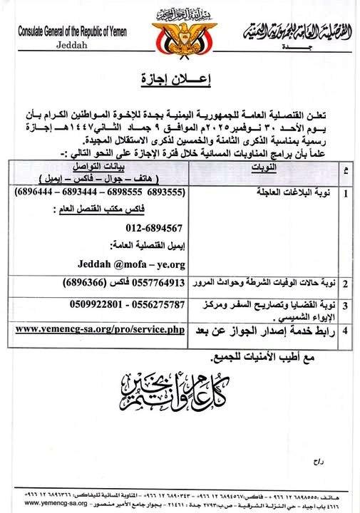تعلن القنصلية العامة للجمهورية اليمنية بجدة لمواطنيها الكرام المقيمين في المملكة العربية السعودية الشقيقة بأن يوم الأحد 30 من نوفمبر 2025م الموافق 9 من جمادي الثاني 1447هـ إجازة رسمية بمناسبة الذكرى الثامنة والخمسين لذكرى الاستقلال المجيد. علماً بأن جدول المناوبات خلال فترة إجازة العيد بحسب التوضيح المرفق في هذا الإعلان.